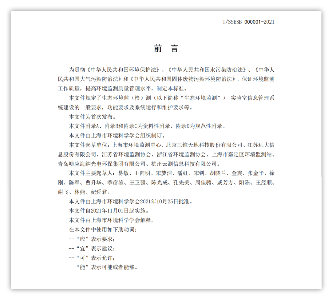 10月25日,由上海市環(huán)境監(jiān)測中心、北京三維天地科技股份有限公司及江蘇、浙江省環(huán)境監(jiān)測協(xié)會等八家單位共同起草的《生態(tài)環(huán)境監(jiān)測實驗室信息管理系統(tǒng)建設技術指南》,經(jīng)上海市環(huán)境科學學會批準,將于2021年11月01日起正式實施。