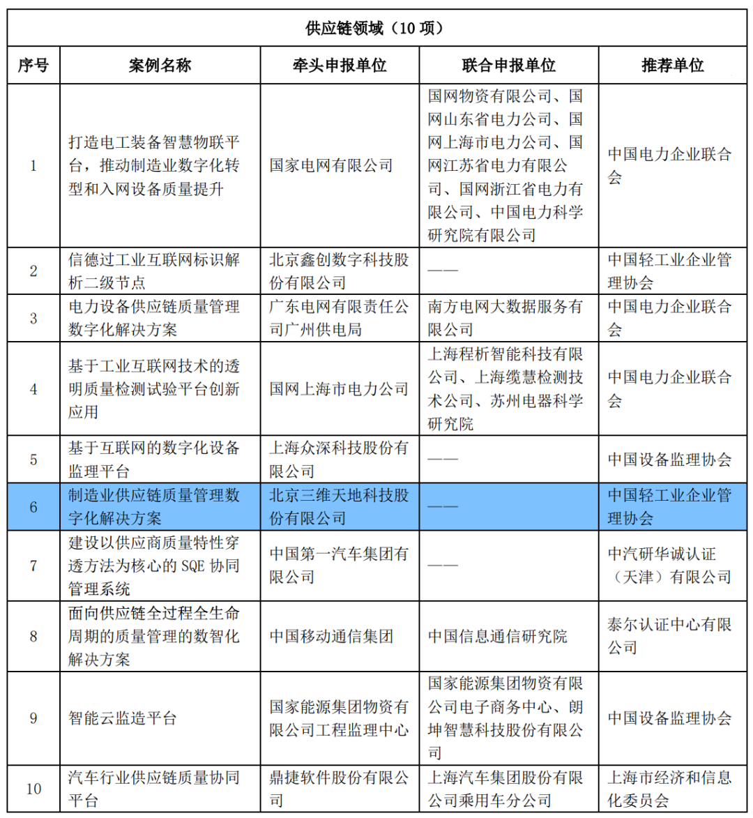 日前,工信部公布2022年制造業(yè)質量管理數(shù)字化解決方案優(yōu)秀案例名單。在供應鏈領域中,北京三維天地科技股份有限公司憑借制造業(yè)供應鏈質量管理數(shù)字化解決方案成功入選,彰顯了工信部及行業(yè)權威專家對三維天地在面向供應鏈領域的質量管理技術研究的高度認可。