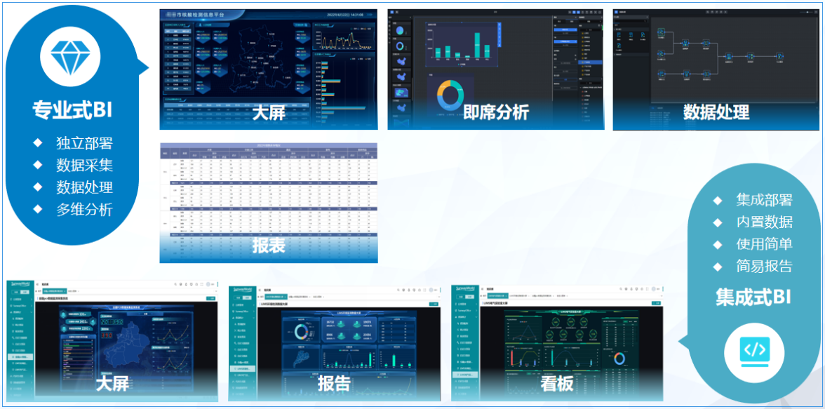 集成式BI是LIMS系統(tǒng)內(nèi)置的將內(nèi)部數(shù)據(jù)到數(shù)據(jù)可視化展現(xiàn)的一種解決方案。集成式BI提供20余種圖表組件及對應的輔助配置、輔助工具,通過拖拽式的場景設計,滿足用戶對于大屏、報告和看板的需求。