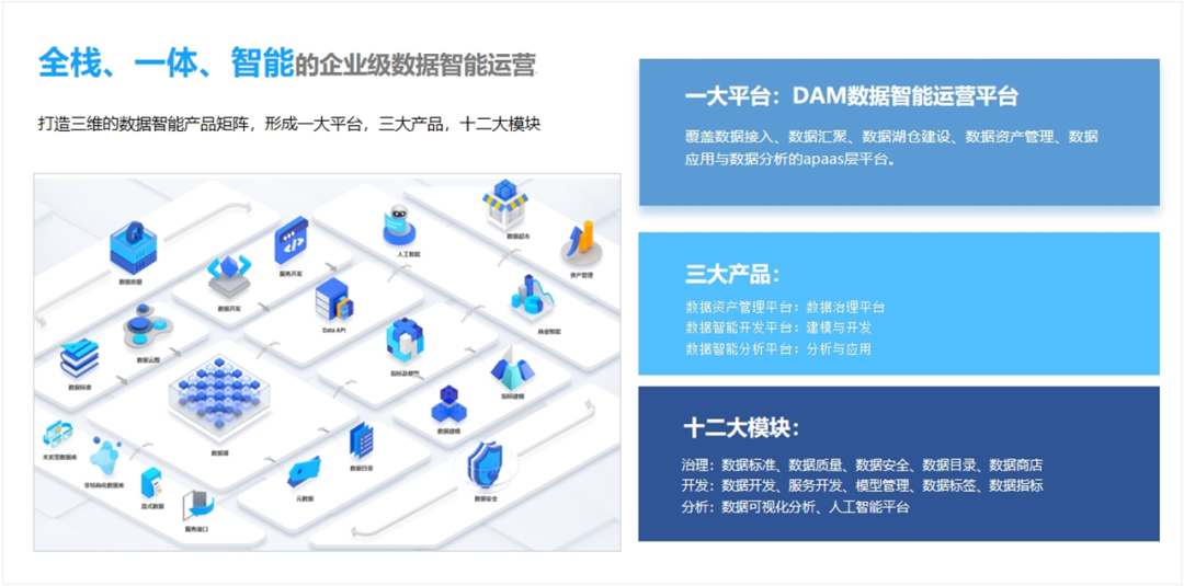2023年10月26日,2023三維天地?cái)?shù)據(jù)資產(chǎn)高峰論壇在北京成功舉辦。期間全新一代的數(shù)據(jù)資產(chǎn)管理平臺(DAM)v13正式與廣大用戶見面。 全新版DAM V13是基于客戶需求變化而進(jìn)行的一次功能迭代。平臺吸收了100+項(xiàng)目實(shí)施過程中用戶提出的重要需求,進(jìn)行統(tǒng)一歸納分析提煉,作為階段性需求進(jìn)行新功能開發(fā),新版本將更貼合項(xiàng)目實(shí)際使用場景,在工具化,自動化、智能化的方向走出堅(jiān)實(shí)的一步,以更好地表達(dá)三維天地的產(chǎn)品對于企業(yè)數(shù)字化轉(zhuǎn)型的支撐價(jià)值。 產(chǎn)品新增了數(shù)據(jù)指標(biāo)、數(shù)據(jù)建模、數(shù)據(jù)標(biāo)簽、人工智能四大模塊,強(qiáng)化數(shù)據(jù)治理、提升用戶洞察力,加速數(shù)據(jù)價(jià)值快速轉(zhuǎn)化的工具支撐;持續(xù)以主動元數(shù)據(jù)為核心,結(jié)合機(jī)器學(xué)習(xí)、深度學(xué)習(xí)、自然語言處理技術(shù),對多模塊功能細(xì)節(jié)進(jìn)行匠心打磨,完善功能閉環(huán),功能點(diǎn)迭代數(shù)量80+,充分提升了智能化水平與數(shù)據(jù)管理效率。 在上一版本的基礎(chǔ)上,DAM V13平臺底座更夯實(shí)、數(shù)據(jù)治理更高效、數(shù)據(jù)開發(fā)更便捷、數(shù)據(jù)運(yùn)營更智能,且擁有更標(biāo)準(zhǔn)及更為閉環(huán)的數(shù)據(jù)治理與智能數(shù)據(jù)分析解決方案。平臺具備搜索問答式數(shù)據(jù)分析系統(tǒng),問答式交互,搜索式體驗(yàn),將變革數(shù)據(jù)分析流程全場景的數(shù)據(jù)整合,讓數(shù)據(jù)“慧”說話;全鏈路協(xié)同的數(shù)據(jù)開發(fā)讓工具回歸為人服務(wù)的本質(zhì),全方位地提升一線數(shù)據(jù)開發(fā)人員/業(yè)務(wù)人員的工作效率。 DAM數(shù)據(jù)資產(chǎn)管理平臺是全棧、一體、智能的企業(yè)級數(shù)據(jù)智能運(yùn)營平臺,形成了一大平臺、三大產(chǎn)品、十二大模塊的完整產(chǎn)品矩陣。主要包括治理、開發(fā)、分析三大產(chǎn)品,涵蓋數(shù)據(jù)目錄、數(shù)據(jù)標(biāo)準(zhǔn)、數(shù)據(jù)質(zhì)量、數(shù)據(jù)安全、數(shù)據(jù)開發(fā)、主數(shù)據(jù)建模、數(shù)據(jù)建模、指標(biāo)建模、標(biāo)簽建模、AI人工智能、BI商業(yè)智能、數(shù)據(jù)超市能等12大模塊,支持從數(shù)據(jù)治理到數(shù)據(jù)開發(fā)到數(shù)據(jù)分析的全鏈路的數(shù)據(jù)資產(chǎn)管理能力。 特性一:增強(qiáng)式數(shù)據(jù)目錄 傳統(tǒng)的數(shù)據(jù)資產(chǎn)目錄主要集中在結(jié)構(gòu)化數(shù)據(jù)庫表管理。而三維天地的數(shù)據(jù)目錄在此基礎(chǔ)上擴(kuò)展了BI看板、ETL作業(yè)、主數(shù)據(jù)模型等類型,可以展示更多樣的數(shù)據(jù)對象,更細(xì)節(jié)的血緣關(guān)系,更及時(shí)的數(shù)據(jù)特征。 特性二:數(shù)據(jù)質(zhì)量的閉環(huán) 在以往項(xiàng)目實(shí)踐中,客戶不愁發(fā)現(xiàn)問題,而是更注重如何將發(fā)現(xiàn)的問題得以解決、將有問題的數(shù)據(jù)整改到位。因此平臺支持?jǐn)?shù)據(jù)質(zhì)量的事前、事中、事后的閉環(huán)管理,即事前需求和規(guī)則定義、事中質(zhì)量監(jiān)控以及事后量化分析和問題追溯。 特性三:治理到自助式敏捷應(yīng)用的閉環(huán) 平臺具備從數(shù)據(jù)治理到自助式敏捷應(yīng)用的閉環(huán)一體化管理。在資產(chǎn)平臺中,數(shù)據(jù)治理結(jié)束后,平臺具備商業(yè)智能、人工智能、指標(biāo)管理、標(biāo)簽畫像以及智能應(yīng)用等各模塊,以滿足用戶的個(gè)性化應(yīng)用的構(gòu)建。當(dāng)已有的應(yīng)用無法滿足訴求時(shí),業(yè)務(wù)人員也可通過數(shù)據(jù)超市自助獲取數(shù)據(jù)、自助分析數(shù)據(jù)。實(shí)現(xiàn)治理到分析的全流程閉環(huán)應(yīng)用。 特性四:基于知識圖譜的增強(qiáng)數(shù)據(jù)治理 平臺結(jié)合AI、知識圖譜,有效提高了數(shù)據(jù)治理的效率,如業(yè)務(wù)域自動分類、數(shù)據(jù)標(biāo)準(zhǔn)自動生成、數(shù)據(jù)資產(chǎn)推薦、智能血緣推薦等,智能化的功能貫穿數(shù)據(jù)資產(chǎn)平臺的方方面面。 特性五:數(shù)據(jù)資產(chǎn)合理評估及入表 在數(shù)據(jù)資產(chǎn)入表的大背景下,產(chǎn)品適時(shí)推出自研的數(shù)據(jù)資產(chǎn)評估模型,通過對數(shù)據(jù)資產(chǎn)的成本因素、場景因素、市場因素和質(zhì)量因素等方面進(jìn)行多維分析評估,為數(shù)據(jù)資產(chǎn)合理定價(jià)及市場流通奠定基礎(chǔ)。 特性六:數(shù)據(jù)開發(fā)和治理一體化 企業(yè)在以往數(shù)據(jù)中臺的建設(shè)效果不顯著。全新平臺將數(shù)據(jù)治理的流程與數(shù)據(jù)開發(fā)的全生命周期深度融合,通過數(shù)據(jù)開發(fā)一體化,在數(shù)據(jù)標(biāo)準(zhǔn)驅(qū)動模型構(gòu)建基礎(chǔ)上,有序高質(zhì)量地進(jìn)行數(shù)據(jù)生產(chǎn),在數(shù)據(jù)開發(fā)過程中,完成數(shù)據(jù)治理。實(shí)現(xiàn)“標(biāo)準(zhǔn)即設(shè)計(jì),設(shè)計(jì)即開發(fā),開發(fā)即治理”的開發(fā)治理一體化理念。 特性七:高效、輕量化的指標(biāo)建模 過去指標(biāo)的建設(shè),依賴開