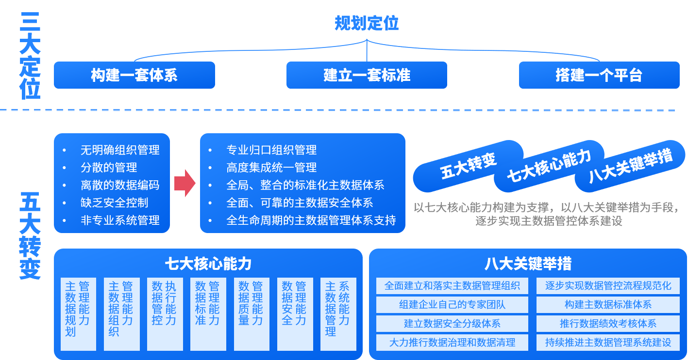 隨著該集團(tuán)業(yè)務(wù)的不斷擴(kuò)展,形成了綠色投資、工程服務(wù)、和高端制造三大業(yè)務(wù)板塊,各類(lèi)業(yè)務(wù)數(shù)據(jù)不斷增加累積,現(xiàn)已沉淀物料、組織機(jī)構(gòu)、員工、客戶、供應(yīng)商等基礎(chǔ)數(shù)據(jù)。集團(tuán)信息化需求和信息化建設(shè)在此期間也經(jīng)歷了一個(gè)從無(wú)到有、從簡(jiǎn)單到復(fù)雜的逐步深入的過(guò)程,從而使得一些需要在整個(gè)企業(yè)范圍內(nèi)各個(gè)系統(tǒng)中共享的基礎(chǔ)數(shù)據(jù)被分散到各個(gè)系統(tǒng)分別管理,導(dǎo)致公司的主數(shù)據(jù)在不同系統(tǒng)中編碼不一致,主數(shù)據(jù)管理缺乏一致性、準(zhǔn)確性、完整性。 在此情況下,該集團(tuán)積極配合國(guó)家能源發(fā)展、節(jié)能減排戰(zhàn)略規(guī)劃,立足于客戶需求,秉承“增產(chǎn)節(jié)能,效益型環(huán)保”理念,堅(jiān)持用科技的力量帶動(dòng)環(huán)保事業(yè)的發(fā)展,亟需建立一個(gè)主數(shù)據(jù)管理系統(tǒng),通過(guò)該系統(tǒng)固化相關(guān)數(shù)據(jù)管理流程和管理規(guī)范,以支撐數(shù)據(jù)標(biāo)準(zhǔn)體系的貫徹執(zhí)行,從而更好地實(shí)現(xiàn)信息資源的充分共享和最大化利用。 一、建體系 規(guī)劃和設(shè)計(jì)集團(tuán)主數(shù)據(jù)標(biāo)準(zhǔn)體系,明確組織分工、梳理管理流程、規(guī)劃藍(lán)圖方案,搭配切實(shí)可控的數(shù)據(jù)管理KPI體系,提升數(shù)據(jù)管理能力,實(shí)現(xiàn)主數(shù)據(jù)管理的體系化、標(biāo)準(zhǔn)化和平臺(tái)化。構(gòu)建一套完整的主數(shù)據(jù)管理體系框架,充分考慮企業(yè)的信息系統(tǒng)及主數(shù)據(jù)需求的實(shí)際情況。 二、定標(biāo)準(zhǔn) 制定主數(shù)據(jù)相關(guān)標(biāo)準(zhǔn)與規(guī)范,并通過(guò)數(shù)據(jù)清洗工作,提升數(shù)據(jù)質(zhì)量;根據(jù)主數(shù)據(jù)分類(lèi)明確相關(guān)管理組織以及職責(zé),制定物料主數(shù)據(jù)標(biāo)準(zhǔn)、管理流程和制度。 三、搭平臺(tái) 搭建集團(tuán)主數(shù)據(jù)管理平臺(tái),實(shí)現(xiàn)對(duì)主數(shù)據(jù)的全生命周期管理;依據(jù)主數(shù)據(jù)標(biāo)準(zhǔn)和主數(shù)據(jù)模型定義的規(guī)則進(jìn)行校驗(yàn)、清洗、發(fā)布,實(shí)現(xiàn)對(duì)主數(shù)據(jù)的全生命周期管理,并整合出統(tǒng)一的、可信任的主數(shù)據(jù)。 四、做共享 集成體系建設(shè),開(kāi)發(fā)一套與集團(tuán)及所屬企業(yè)相關(guān)應(yīng)用軟件的接口設(shè)計(jì)與集成主數(shù)據(jù)集成接口;通過(guò)統(tǒng)一和標(biāo)準(zhǔn)化物料主數(shù)據(jù),可以消除因物料編碼不一致所造成的集團(tuán)之間物料管理混亂和協(xié)同困難的情況,實(shí)現(xiàn)集團(tuán)之間信息的共享,進(jìn)一步實(shí)現(xiàn)物料的全生命周期跟蹤和追溯。 五、接運(yùn)維 建立一套主數(shù)據(jù)管理運(yùn)維體系,并通過(guò)知識(shí)轉(zhuǎn)移,培養(yǎng)集團(tuán)數(shù)據(jù)管理團(tuán)隊(duì)。制定基礎(chǔ)培訓(xùn)、應(yīng)用培訓(xùn)以及運(yùn)維培訓(xùn)、開(kāi)發(fā)培訓(xùn)計(jì)劃,針對(duì)本項(xiàng)目的基本情況宣貫、系統(tǒng)的基礎(chǔ)功能使用操作、日常運(yùn)維管理、管理員操作等基礎(chǔ)知識(shí)進(jìn)行培訓(xùn)。 通過(guò)本項(xiàng)目的建設(shè),確定集團(tuán)主數(shù)據(jù)體系建設(shè)的整體發(fā)展思路為“以七大核心能力構(gòu)建為支撐,以八大關(guān)鍵舉措為手段,逐步實(shí)現(xiàn)主數(shù)據(jù)管控體系建設(shè)”。即在進(jìn)行主數(shù)據(jù)規(guī)劃管理能力、數(shù)據(jù)組織管理能力、數(shù)據(jù)管控執(zhí)行能力、數(shù)據(jù)標(biāo)準(zhǔn)管理能力、數(shù)據(jù)質(zhì)量管理能力、數(shù)據(jù)安全管理能力、主數(shù)據(jù)管理系統(tǒng)能力“七大核心能力”建設(shè)的基礎(chǔ)上,制定今后集團(tuán)主數(shù)據(jù)體系的各項(xiàng)發(fā)展目標(biāo),并通過(guò)主數(shù)據(jù)管理組織固化、專(zhuān)家團(tuán)隊(duì)建設(shè)、主數(shù)據(jù)標(biāo)準(zhǔn)體系構(gòu)建、主數(shù)據(jù)治理和主數(shù)據(jù)清理、主數(shù)據(jù)管控流程標(biāo)準(zhǔn)、主數(shù)據(jù)安全分級(jí)體系、主數(shù)據(jù)績(jī)效考核和主數(shù)據(jù)管理系統(tǒng)建設(shè)等“八大關(guān)鍵舉措”,保障主數(shù)據(jù)體系規(guī)劃內(nèi)容的落實(shí)和實(shí)施。 三維天地通過(guò)本期主數(shù)據(jù)項(xiàng)目建設(shè),促進(jìn)了該集團(tuán)物料數(shù)據(jù)共享率的提高,進(jìn)而使得構(gòu)建全集團(tuán)范圍內(nèi)的“物資管理中心模式”成為可能;通過(guò)主數(shù)據(jù)管理實(shí)現(xiàn)了數(shù)據(jù)的標(biāo)準(zhǔn)化、一致性和準(zhǔn)確性,提高了數(shù)據(jù)質(zhì)量;減少了重復(fù)數(shù)據(jù)、錯(cuò)誤數(shù)據(jù)和不完整數(shù)據(jù)的出現(xiàn),提高了數(shù)據(jù)的可用性和可靠性。 主數(shù)據(jù)管理使得該集團(tuán)能夠更好地整合和管理各個(gè)二級(jí)單位的數(shù)據(jù),從而提高了業(yè)務(wù)流程的效率;通過(guò)統(tǒng)一的數(shù)據(jù)源,減少了數(shù)據(j