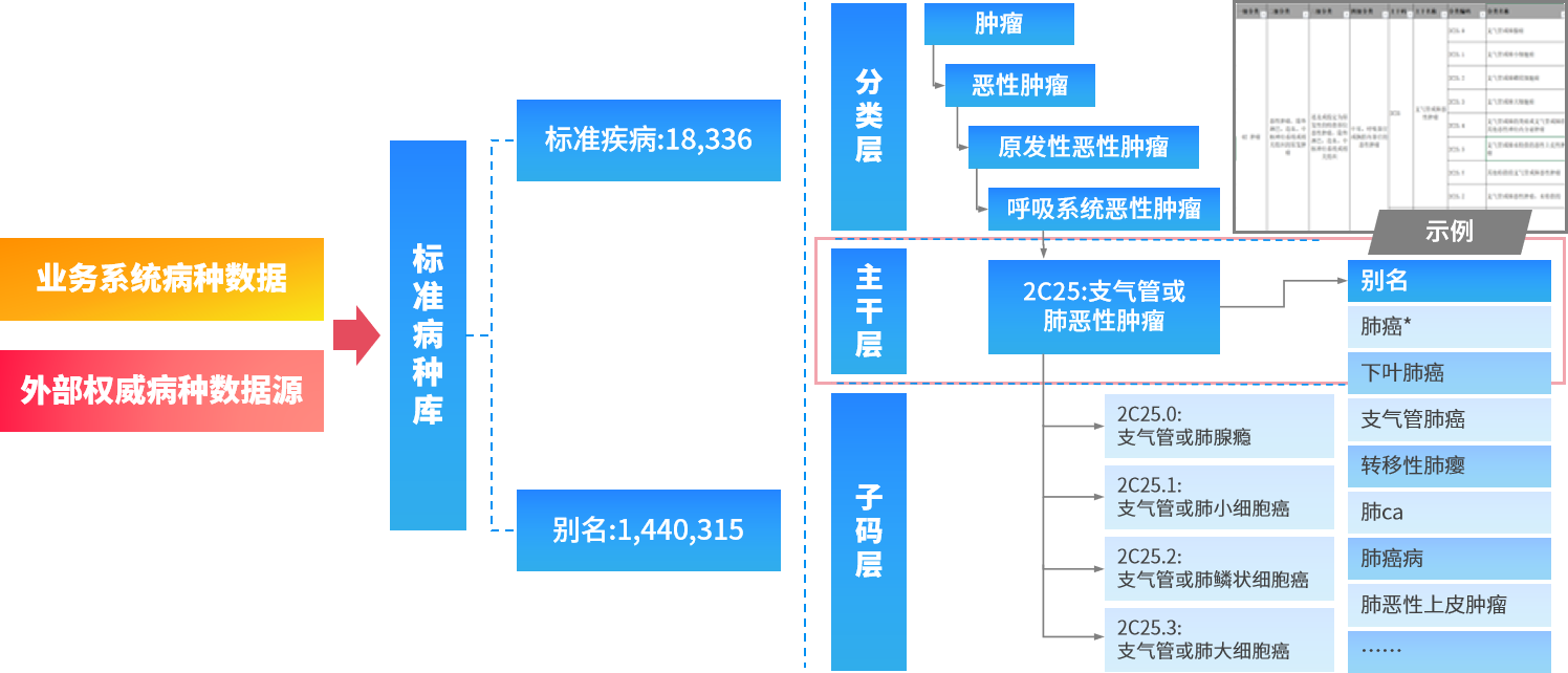 沒有統(tǒng)一標(biāo)準(zhǔn)的病種數(shù)據(jù),導(dǎo)致的核心問題主要為基于病種開展的相關(guān)數(shù)據(jù)分析復(fù)雜且不準(zhǔn)確,分析人員需要將多種不規(guī)范的病種描述轉(zhuǎn)譯成統(tǒng)一名稱開展數(shù)據(jù)分析,從而導(dǎo)致分析工作的時間周期長及分析不準(zhǔn)確的問題,因此疾病分類主數(shù)據(jù)建設(shè)的主要目標(biāo)為建立標(biāo)準(zhǔn)的疾病分類檔案庫,并可提供便捷的匹配服務(wù),以便更好地支持基于病種進(jìn)行用戶數(shù)據(jù)分析,以及后續(xù)開展病種知識庫建設(shè)形成病種知識庫建設(shè)的數(shù)據(jù)基礎(chǔ)。