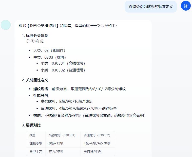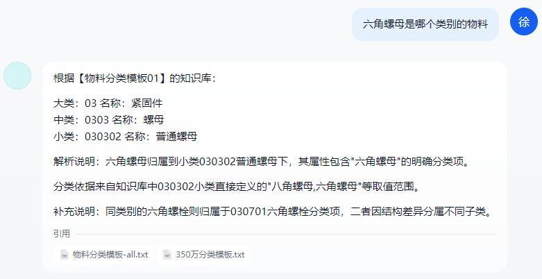 解決方案: 智能問答交互:用戶只需通過自然語言輸入問題(如“查詢類別為xxx的標(biāo)準(zhǔn)定義”、“根據(jù)物料長描述xxx推薦物料分類”),系統(tǒng)自動解析問題并精準(zhǔn)匹配知識庫中的物料標(biāo)準(zhǔn)信息,無需復(fù)雜操作。