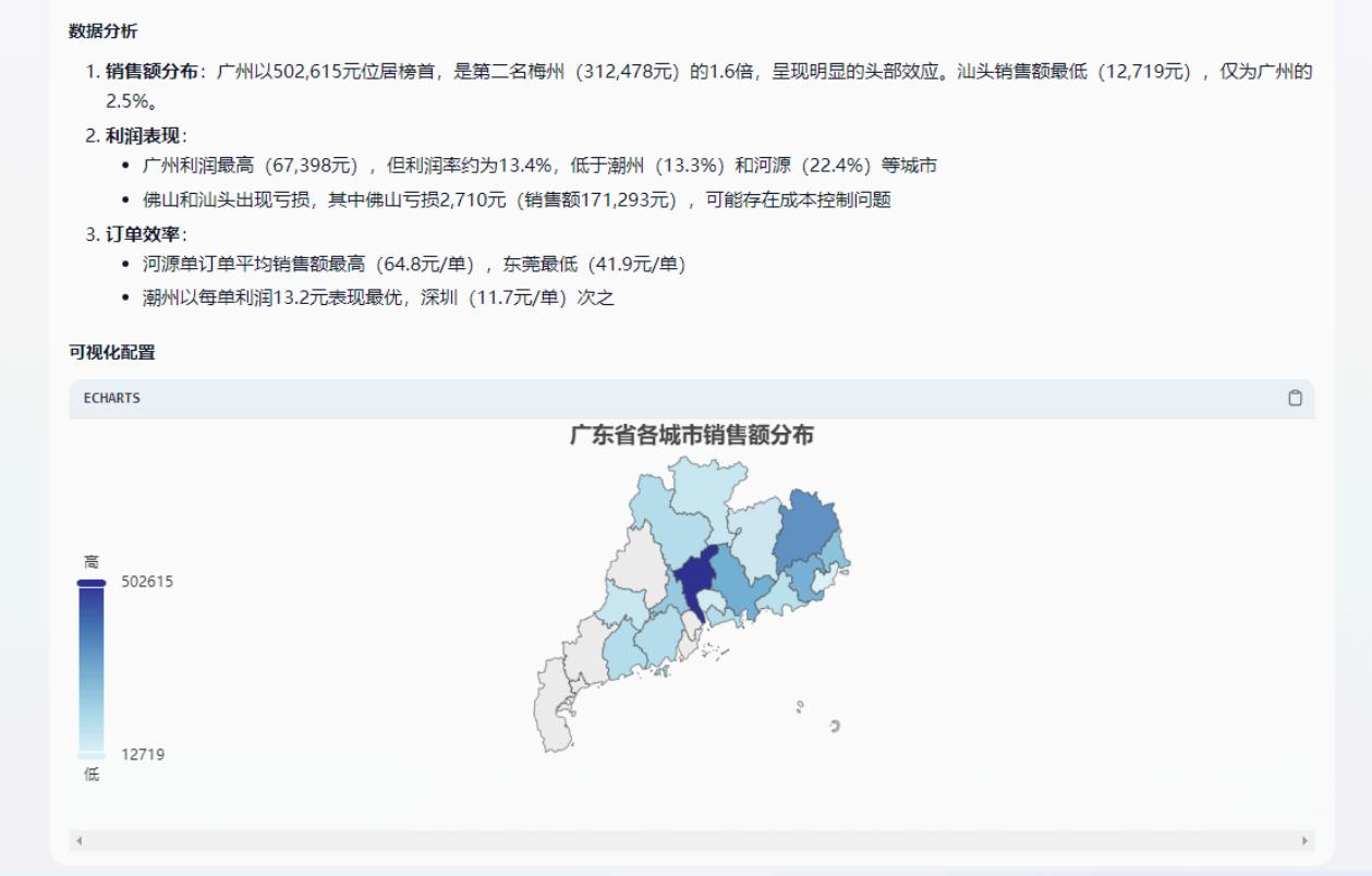 動態(tài)可視化:根據(jù)分析需求自動匹配圖表(趨勢圖、熱力圖等),支持交互式探索; 報告自動生成:一鍵輸出包含關(guān)鍵結(jié)論、數(shù)據(jù)摘要的可視化報告,提升決策效率。