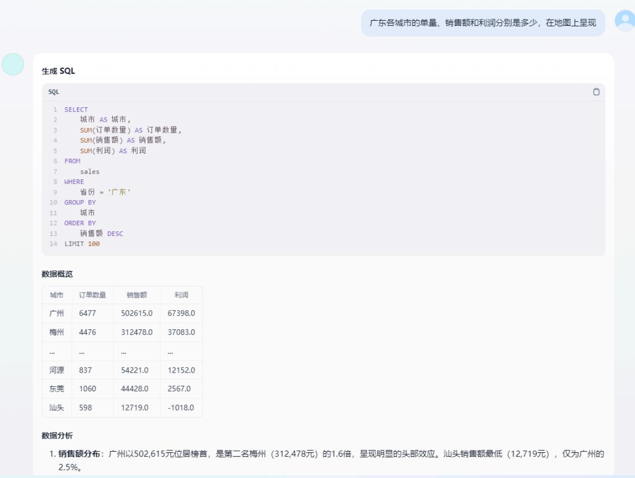 解決方案: 自然語言交互:通過對話式輸入(如 “對比Q3各區(qū)域銷售額” )自動生成分析邏輯,無需編寫代碼;