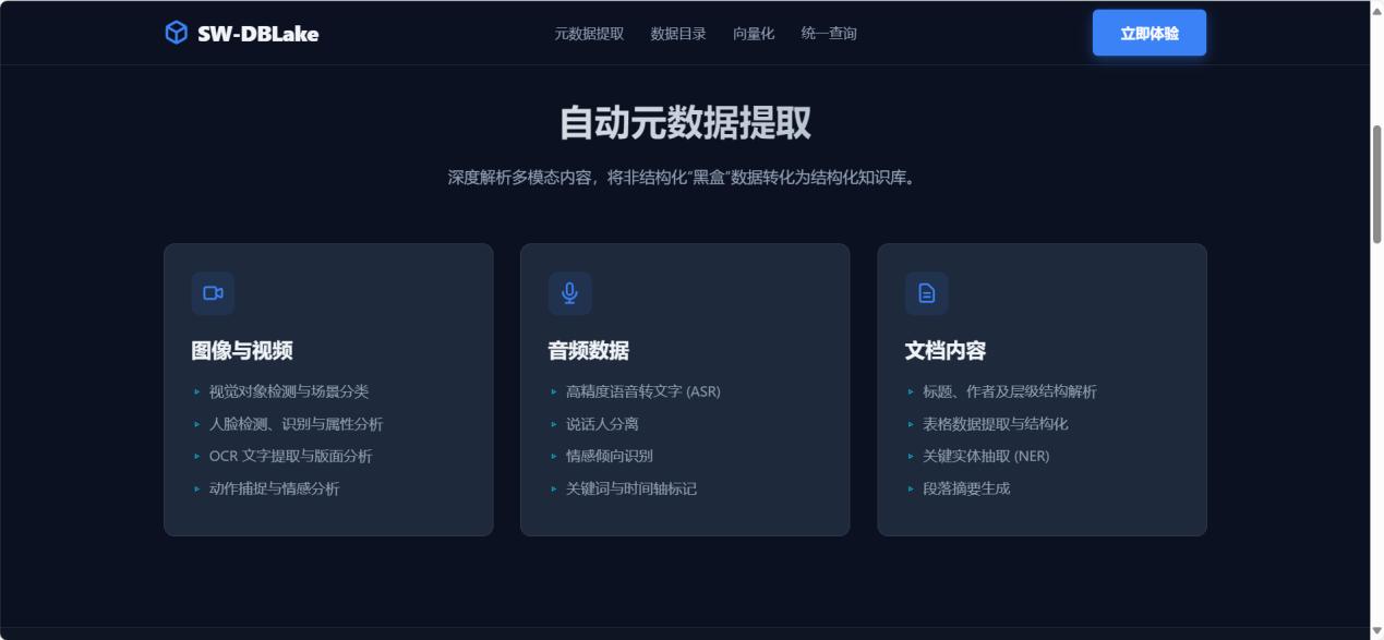 面對這一行業(yè)核心痛點,三維天地以下一代數(shù)據(jù)架構(gòu)為藍圖,正式發(fā)布顛覆性的多模態(tài)數(shù)據(jù)湖產(chǎn)品:SW-DBLake。該產(chǎn)品旨在為企業(yè)構(gòu)建統(tǒng)一、高效、AI原生的多模態(tài)數(shù)據(jù)管理基座,使企業(yè)從繁瑣的數(shù)據(jù)治理工作中解脫出來,更專注于智能應用本身的價值創(chuàng)造。