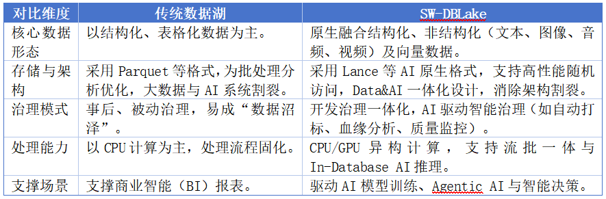 SW-DBLake的核心定位,是成為AI時代面向多模態(tài)數(shù)據(jù)的統(tǒng)一治理底座。它從根本上重構(gòu)了數(shù)據(jù)的存儲、管理和處理方式,有效解決了傳統(tǒng)數(shù)據(jù)架構(gòu)在多模態(tài)、智能化場景下長期存在的治理困境,相較于傳統(tǒng)數(shù)據(jù)湖,SW-DBLake有如下能力提升。
